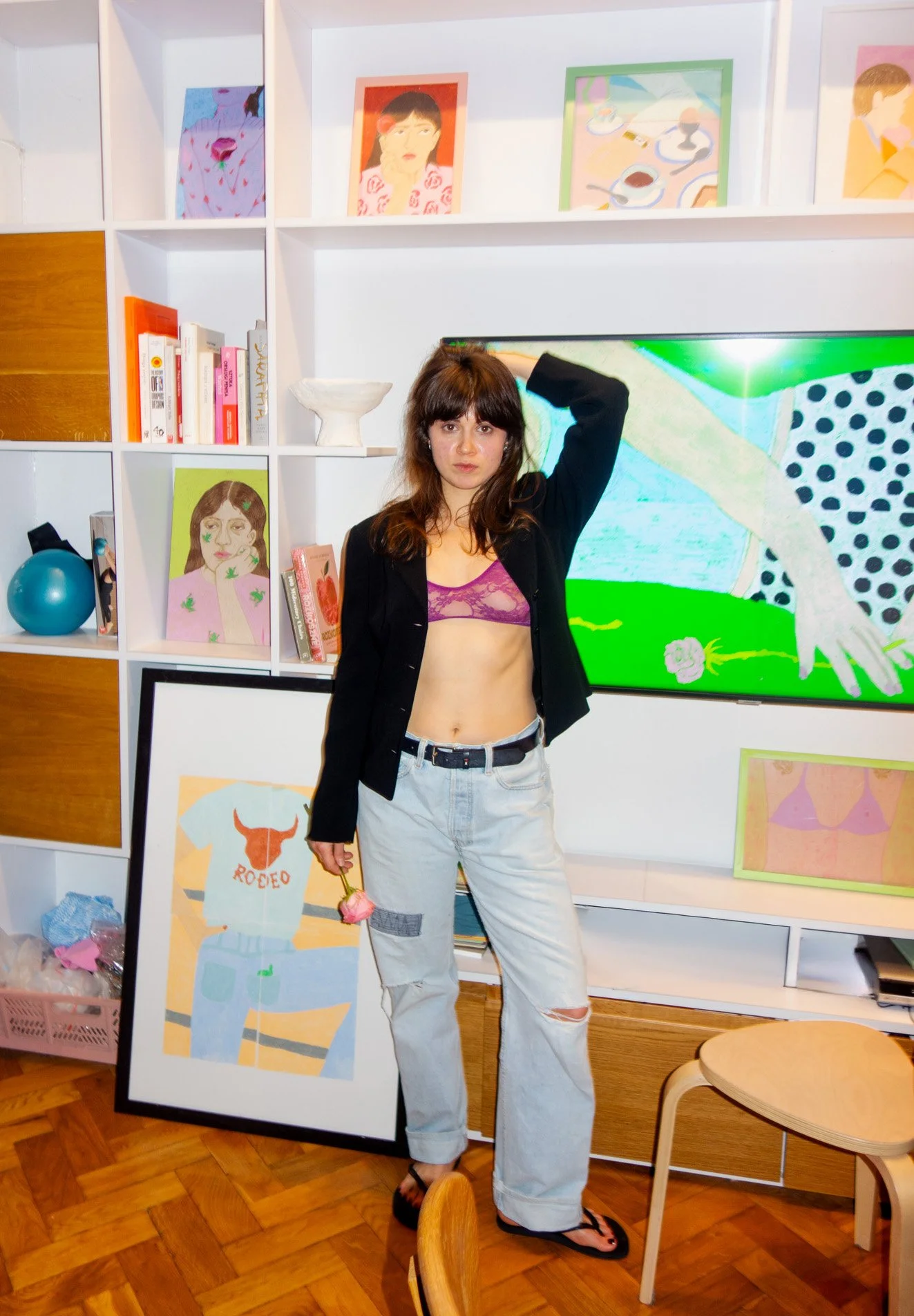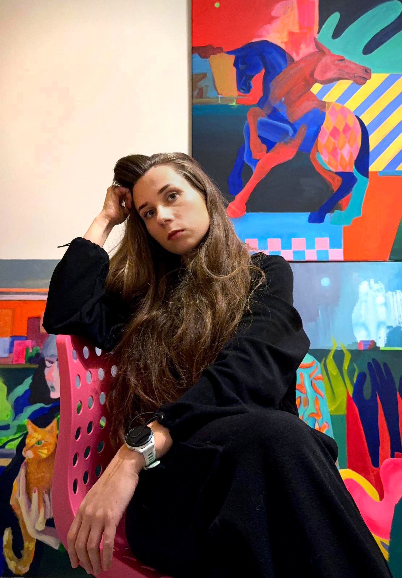 Through simplified forms, vibrant colors and a slightly childlike visual language, she explores the relationship between the body, nature and inner emotional landscapes.