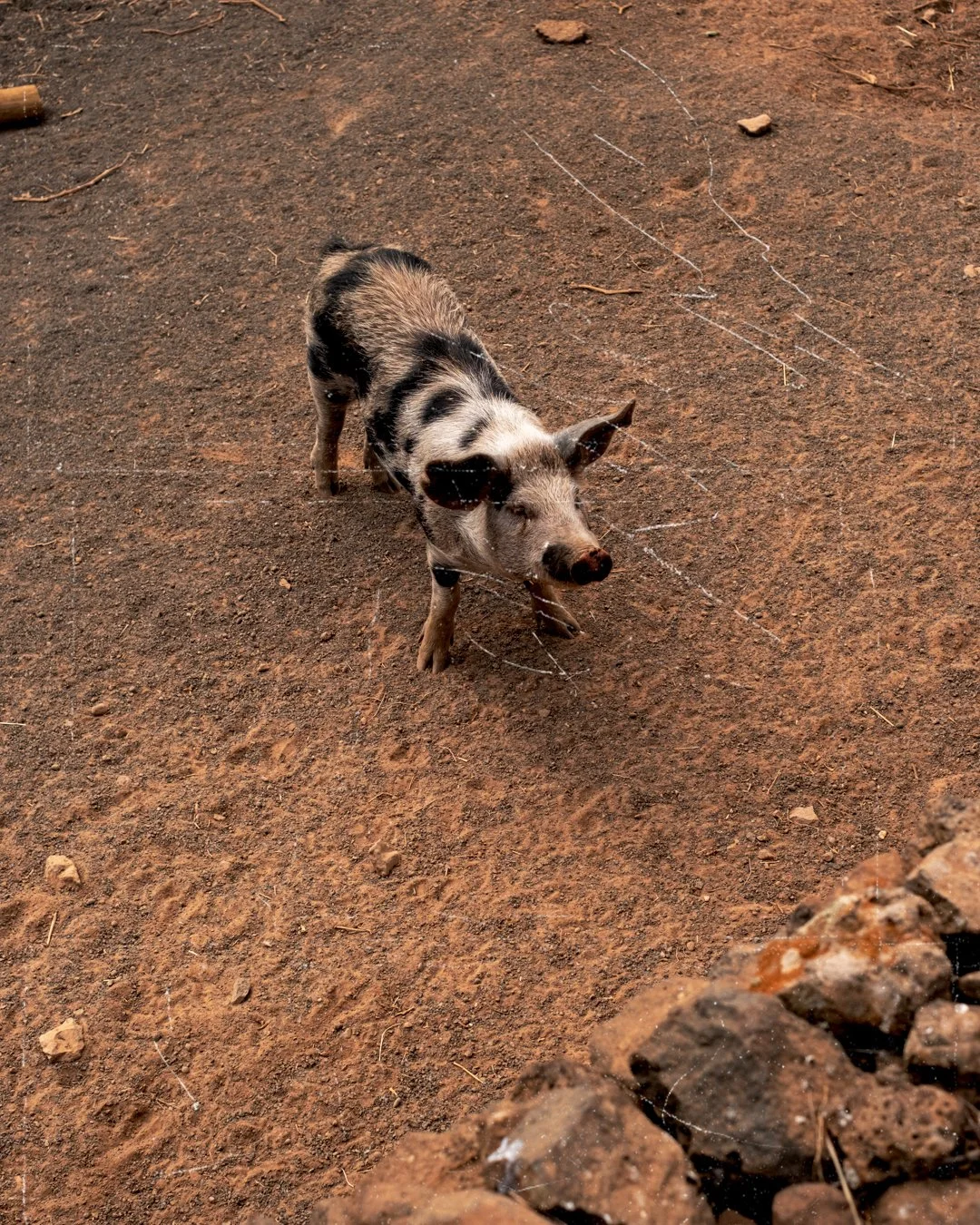 Tempeh (a Pietrain Duroc) came to us as a spare from a farm; if he hadn't been rescued, he likely would have been killed. Today, he is forever our "little kid". Tofu, a Canarian pig, was brought in to keep Tempeh company and quickly became the one in charge. As a breed that faces challenges coping with weight at full size, Tofu needs to stay active.