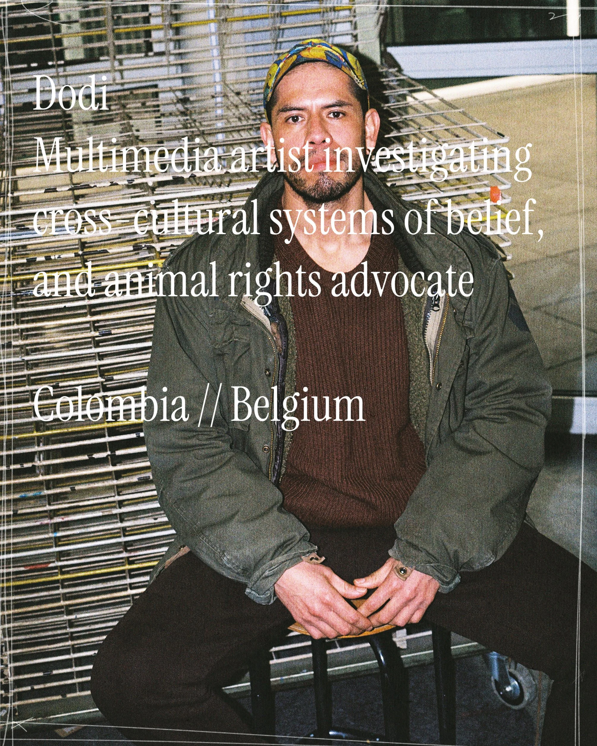 A Mexican multimedia artist residing in Belgium, Dodi's practice includes sculpture, painting, performance, and participatory rituals. His art explores themes of migration, queerness, social justice, and the ongoing impacts of colonialism. A central motif in his work is the banana, which he uses to critique the colonial legacy of the global fruit trade, monoculture, and ecological fragility. His artistic research is heavily tied to his animal rights advocacy and plant-based lifestyle, and his pieces have been acquired by institutions like the MAS Museum and Mu.ZEE