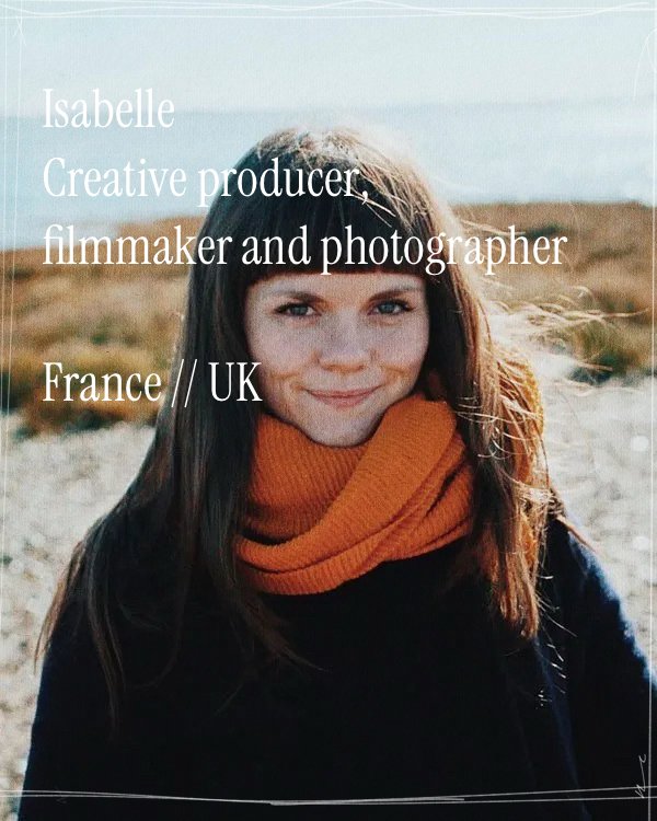 Born in France and based in London, Isabelle is a creative producer, artist, and photographer. For over ten years, she has partnered with charities, agencies, and purpose-driven brands to craft thought-provoking films and photographs. Her documentary-style work centers heavily on human stories, portraiture, and the intersections of art, social justice, nature, and sustainability.