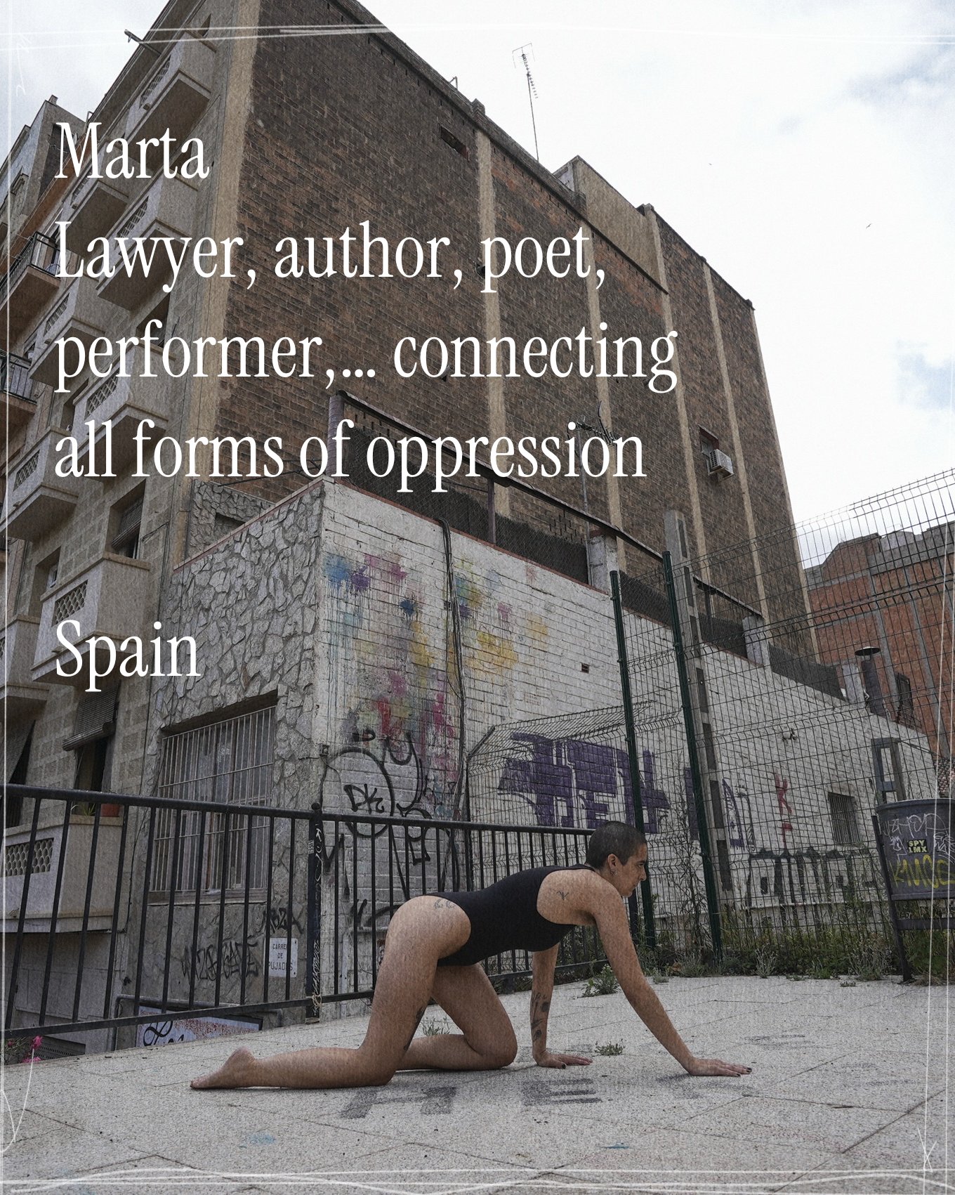 Born in Barcelona in 1987, Marta describes her journey through the lens of "lesbotransfeminism" and anti-speciesism. Her biography emphasizes exploring human experiences through poetry and mystery, championing friendship-centrism and kindness as political practices. A sexual dissident, she dreams of a world entirely free of authority and dynamics of oppression.