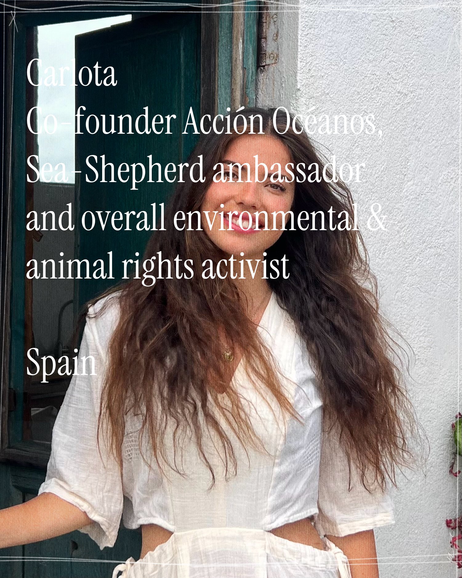 Carlota is an environmental and animal rights activist, Registered Dietitian, and author based in Spain. She utilizes social media to educate audiences on climate challenges, sustainable fashion, vegan food, and species extinction. She also travels globally to document endangered ecosystems and species, such as the northern white rhinoceros and great apes. Carlota has written two books on sustainability, co-founded the NGO Acción Océanos, and acts as an ambassador for Sea Shepherd and the European Climate Pact.